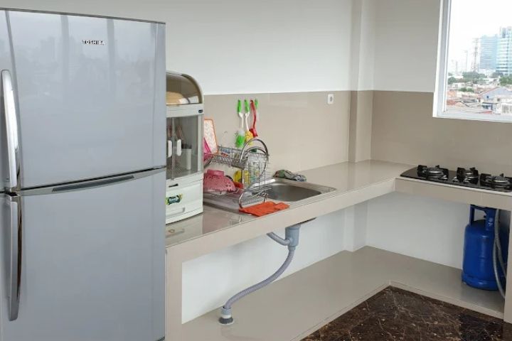 • Dapur bersama dengan kulkas, kompor gas, peralatan masak sederhana, serta meja bar